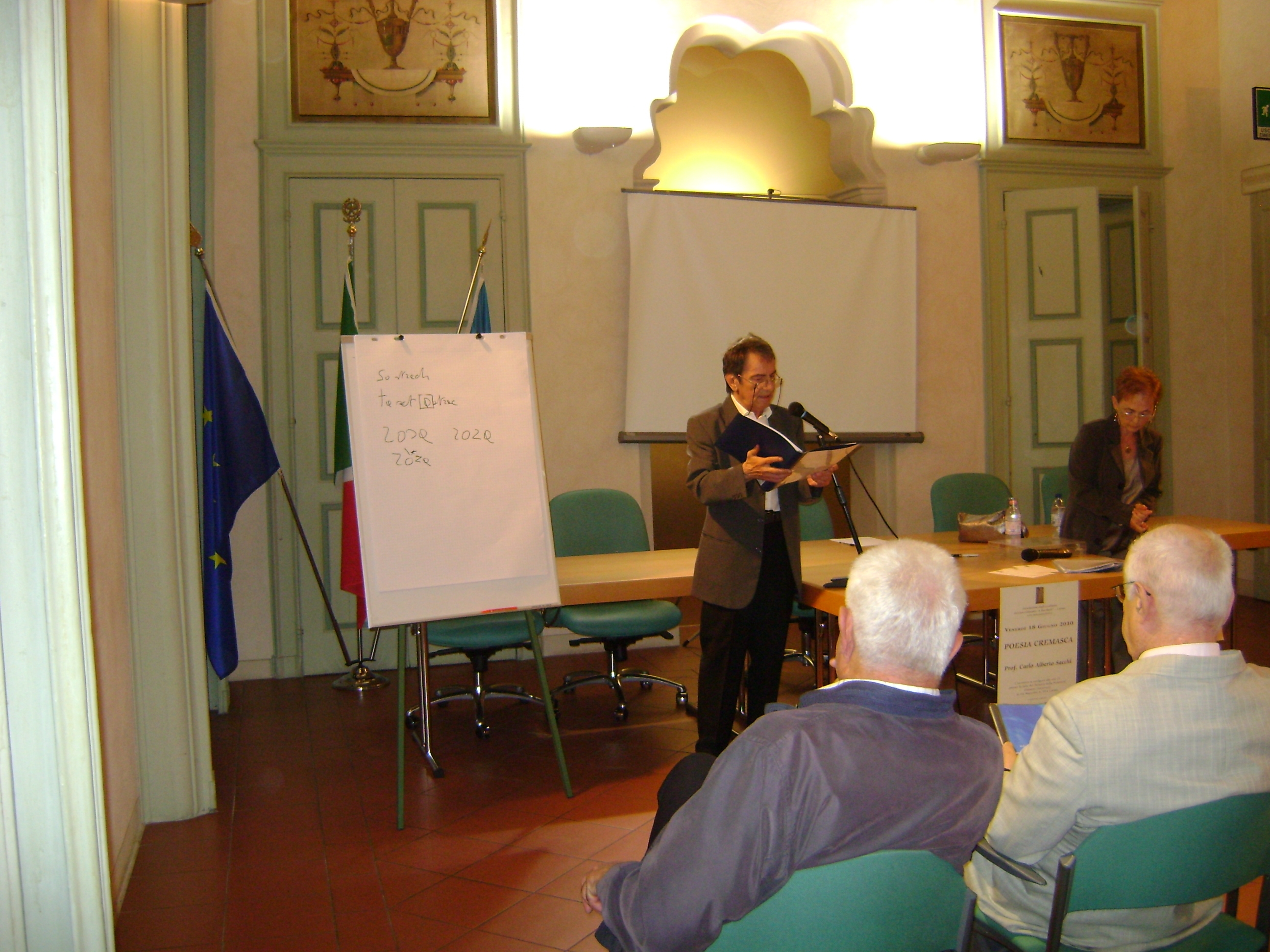 Una serata ricca di contenuti, quella offerta dal prof. Carlo Alberto Sacchi venerdì 18 giugno a Crema. E’ stata la poesia cremasca la protagonista di questa iniziativa, che ha raccolto a Palazzo Vimercati, oltre al prof. Sacchi, la poetessa Graziella Vailati, che si è alternata con lui nel recitare brani poetici in cremasco, ed altre autorità in materia, primo tra tutti il prof. Luciano Geroldi. Graditissima la presenza della poetessa Lina Casalini e del signor Franco Maestri, molto noti ed apprezzati dai cultori di poesia cremasca.