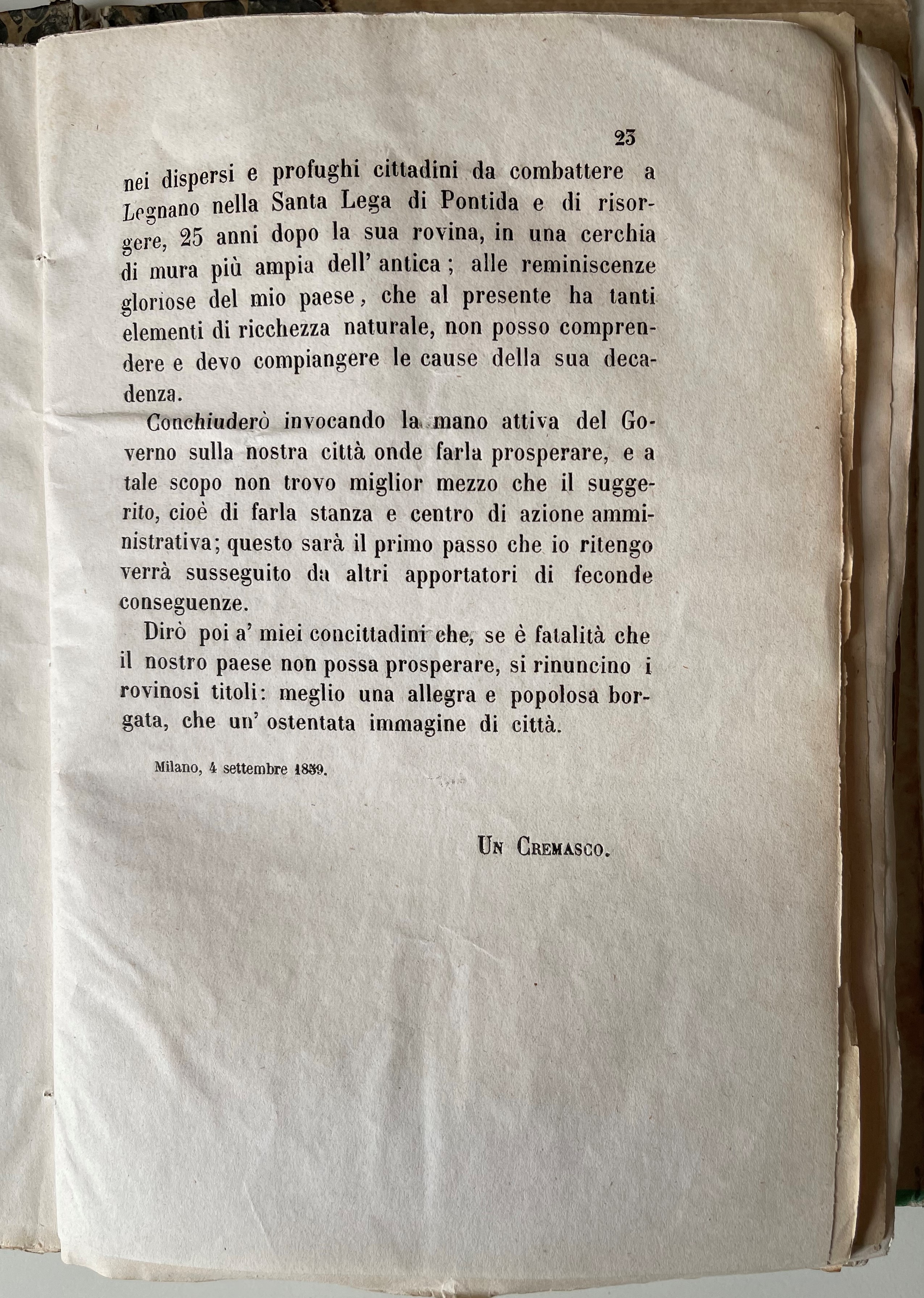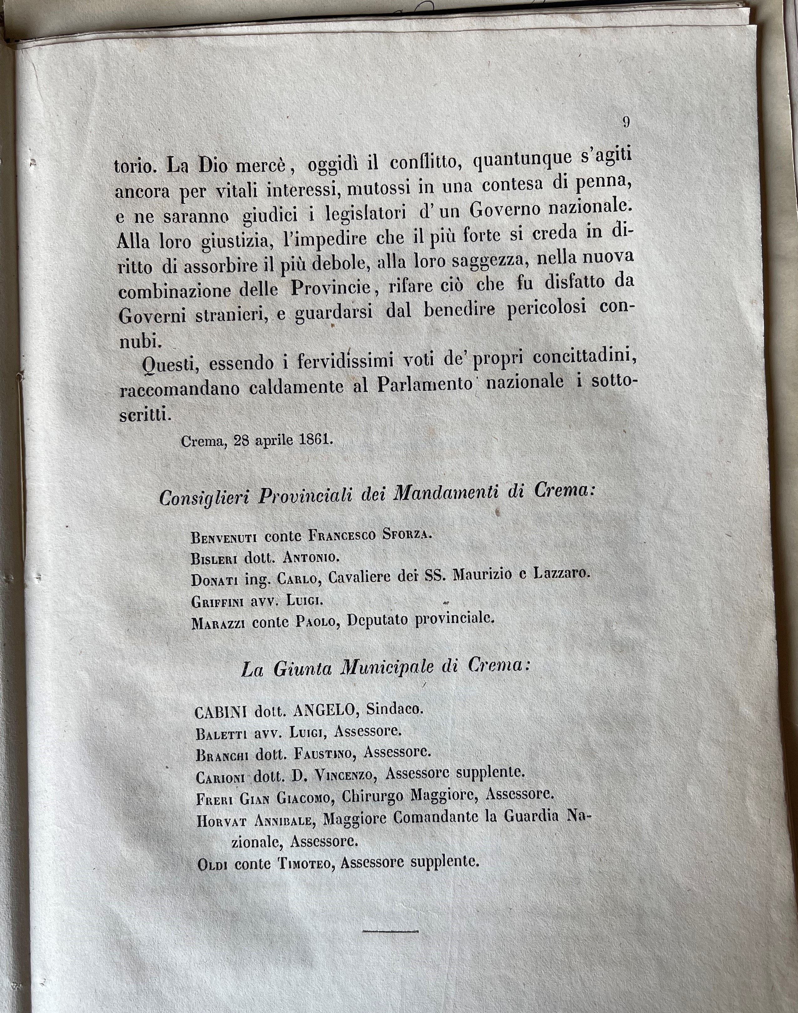 Con il riordino amministrativo italiano del 1859 (legge Rattazzi) e del 1865 (legge Lanza), la perdita definitiva dell'autonomia provinciale e l'inserimento nella Provincia fi Cremona (Circondario di Crema).