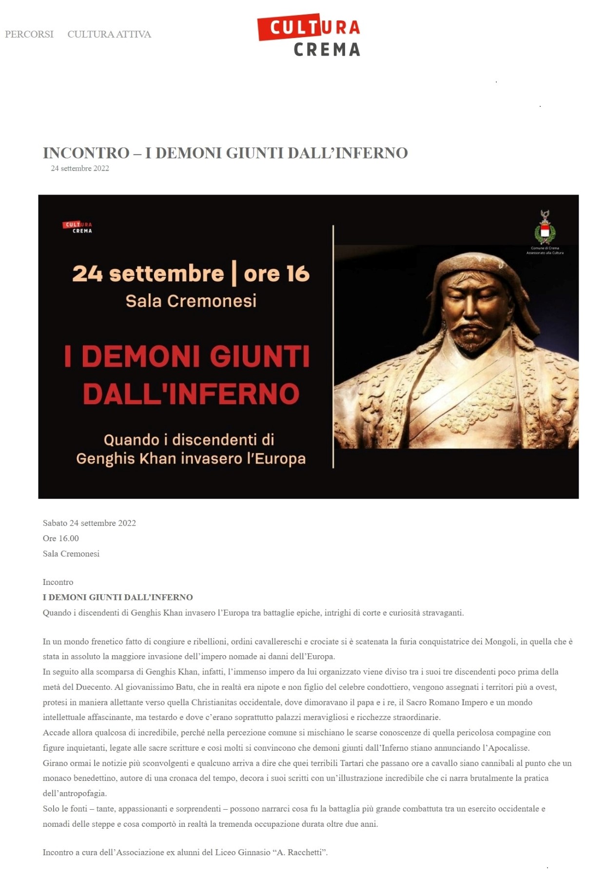 Sabato 24 settembre 2022 si è svolta, presso la sala Cremonesi del Museo Civico di Crema e del Cremasco, la conferenza dal titolo "I demoni giunti dall'Inferno. Quando i discendenti di Gengis Khan invasero l'Europa, tra battaglie epiche, intrighi di corte e curiosità stravaganti". Relatrice è stata Jennifer Radulovic, storica, scrittrice e divulgatrice culturale.