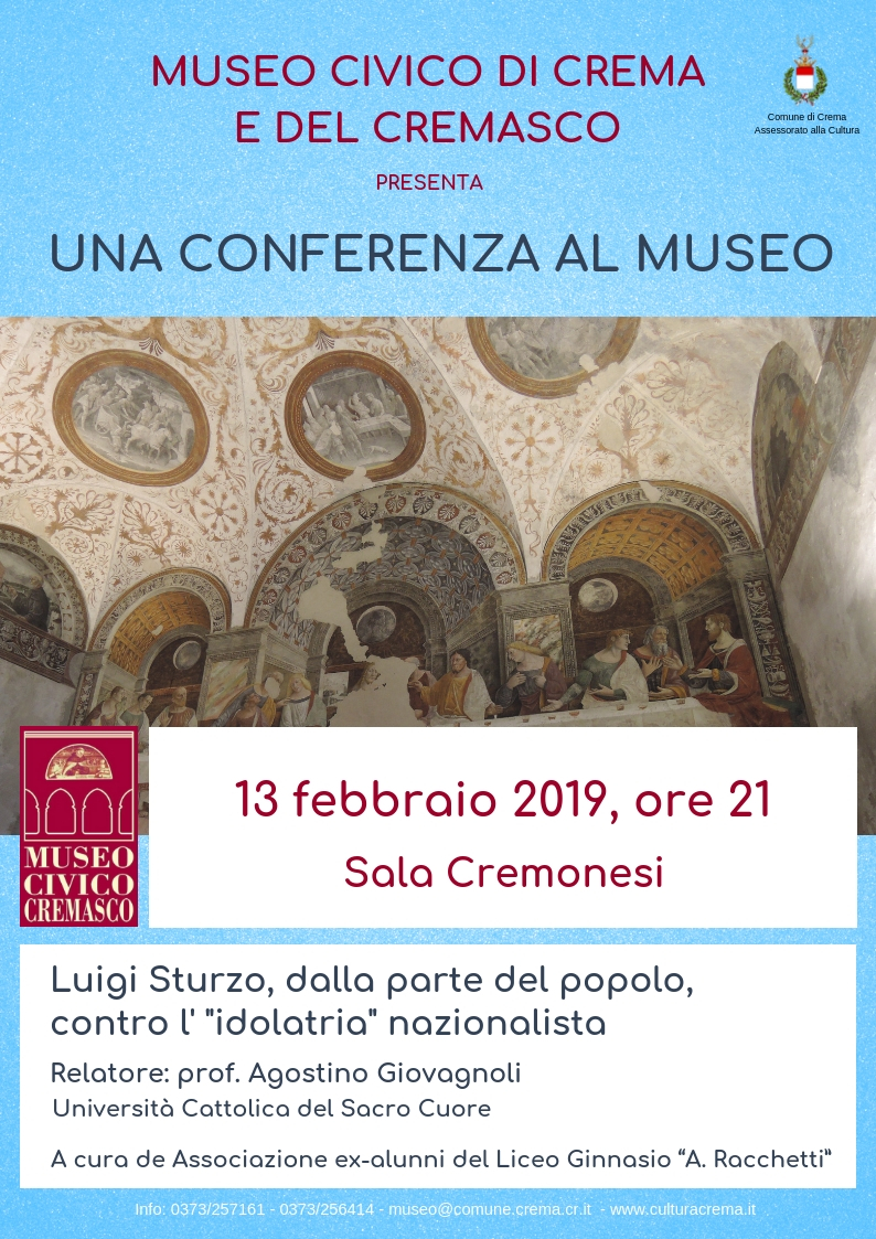L’Associazione degli ex alunni del Liceo Ginnasio “A. Racchetti” - Crema è lieta di invitarvi alla conferenza Luigi Sturzo, dalla parte del popolo, contro l’“idolatria” nazionalista che si terrà mercoledì 13 febbraio 2019 alle ore 21,00 nella sala Cremonesi del Museo Civico di Crema e del Cremasco.