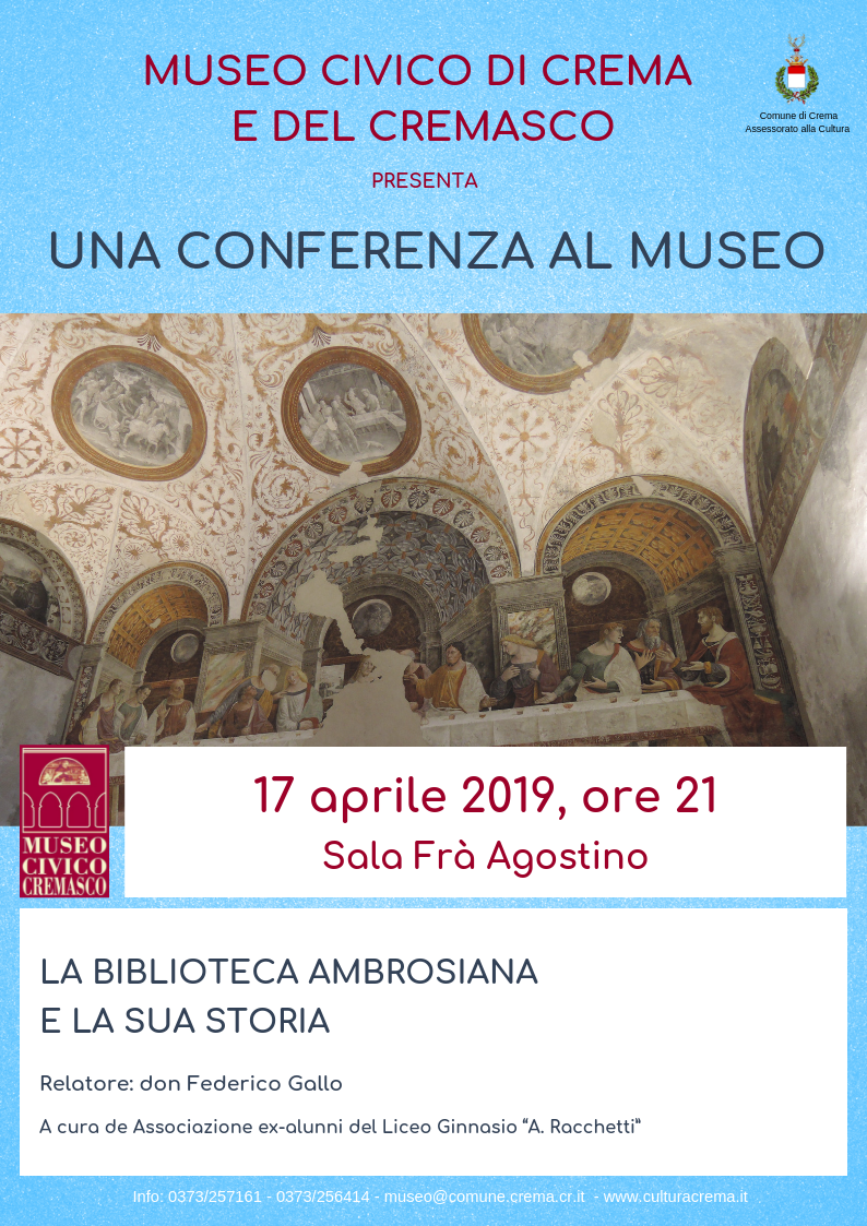 L’Associazione degli ex alunni del Liceo Ginnasio “A. Racchetti” - Crema è lieta di invitarvi alla conferenza La Biblioteca Ambrosiana e la sua storia che si terrà mercoledì 17 aprile 2019 alle ore 21,00 nella Saletta fra’ Agostino del Museo Civico di Crema e del Cremasco. Relatore sarà il canonico dottor Federico Gallo che dal 2008 è Dottore dell’Ambrosiana, dal 2010 Direttore degli Studi Greci e Latini e dal 2012 Direttore della Biblioteca.