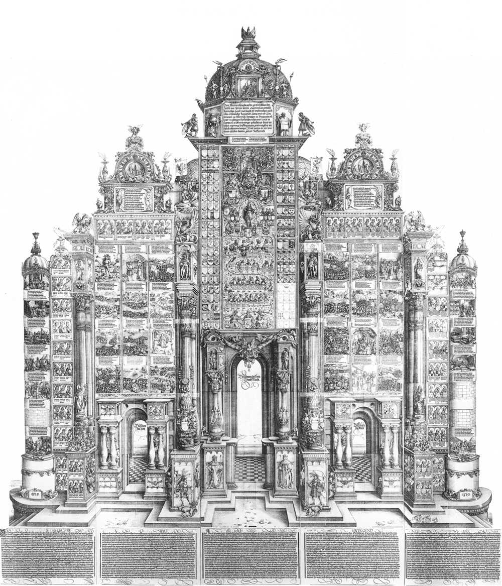 Nel periodo dell’Umanesimo, i testi principali della cultura classica sono riscoperti e intensamente studiati, commentati, pubblicati: l’eredità classica modella la nuova concezione dell’uomo e i percorsi del sapere in tutti gli ambiti della conoscenza. Il classicismo è la chiave per comprendere alcune delle opere più importanti fra Umanesimo e Rinascimento: è il caso della Porta dell’Onore di Albrecht Dürer per Massimiliano I d’Asburgo. Nella primavera del 1512 Massimiliano I, imperatore del Sacro Romano Impero, concepisce uno dei più sorprendenti strumenti di propaganda: un maestoso arco trionfale su carta, un grande poster alto e largo oltre tre metri, raffigurante il Trionfo degli Asburgo dalle origini antichissime alle conquiste presenti. Per trasfigurare la storia in mito, per fingere la realtà in simboli perenni, l’imperatore chiama il grande Albrecht Dürer, l’artista tedesco che dal Rinascimento italiano aveva imparato ad attualizzare i classici. Le 192 incisioni compongono un meraviglioso tripudio di parole e immagini, destinate, grazie alla riproducibilità della stampa, a resistere quasi più del marmo e a essere diffuse presso le principali corti europee. La comunicazione politica raggiunge qui una delle vette più alte per la qualità artistica dell’opera, attraverso i linguaggi figurativi e verbali plasmati dai modelli classici.